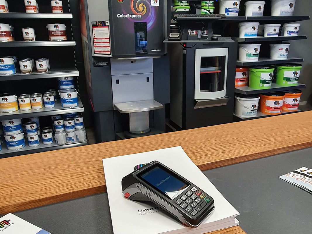 - unsere Farbmischanlage, die jeden beliebigen Farbton anmischt